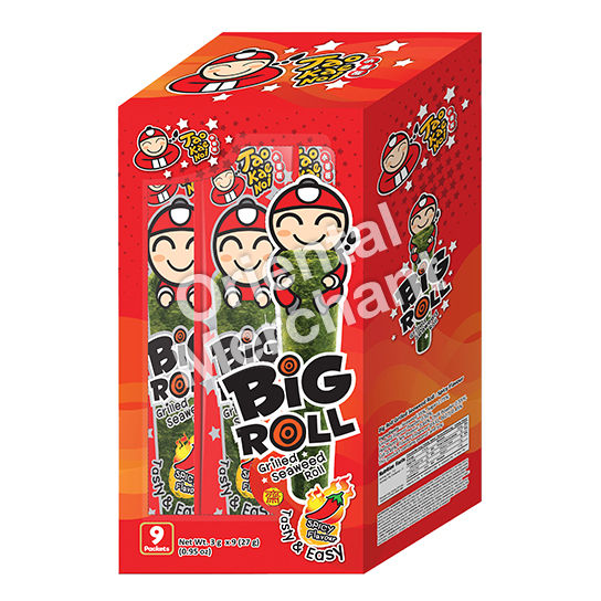 Tao Kae Noi Big Roll Grilled Seaweed Roll (Spicy Flavour) are nine individually packed grilled seaweed rolls, dusted with spicy seasoning. Delicious and crunchy, these snacks are perfect to be eaten during any occasion. Made from high quality seaweed and processed through the finest technology to preserve the wholesome goodness of seaweed, these snacks are healthy, tasty and convenient.